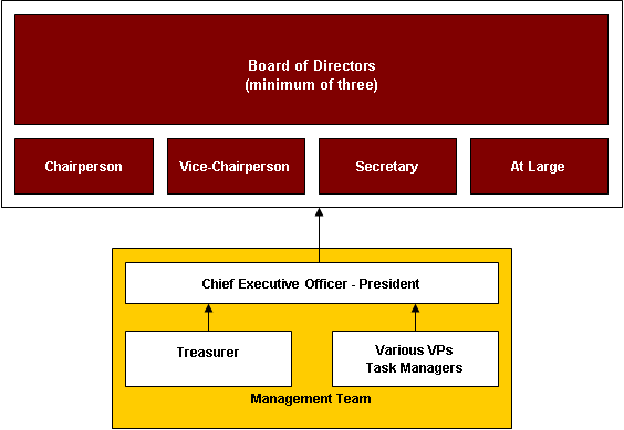 The Management Team carries out the day to day activities under the direction of the Board. By reporting to the CEO, the Treasurer and the various Vice-Presidents/Task Managers can be guided as a team and monitored to assure that all assignments are on schedule and according to established guidelines and procedures.